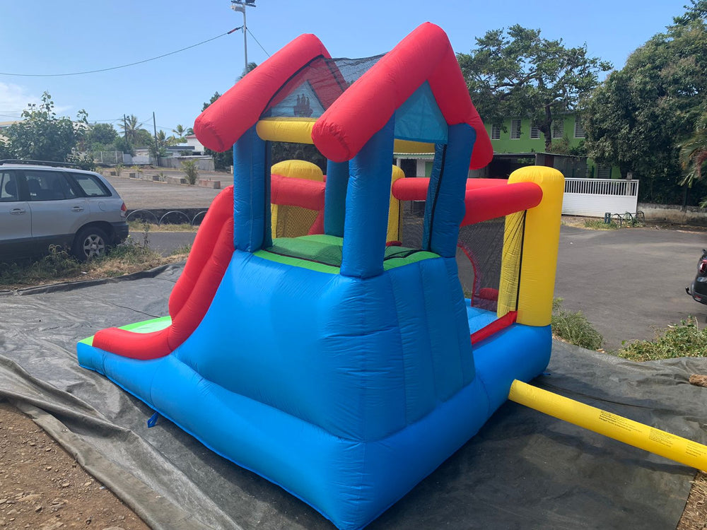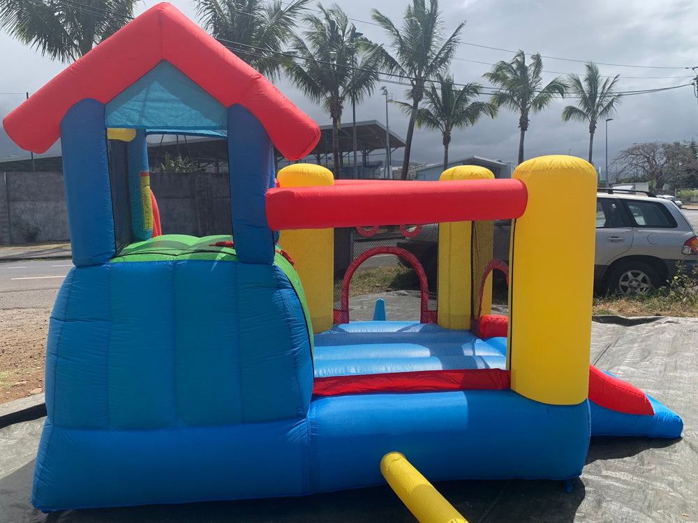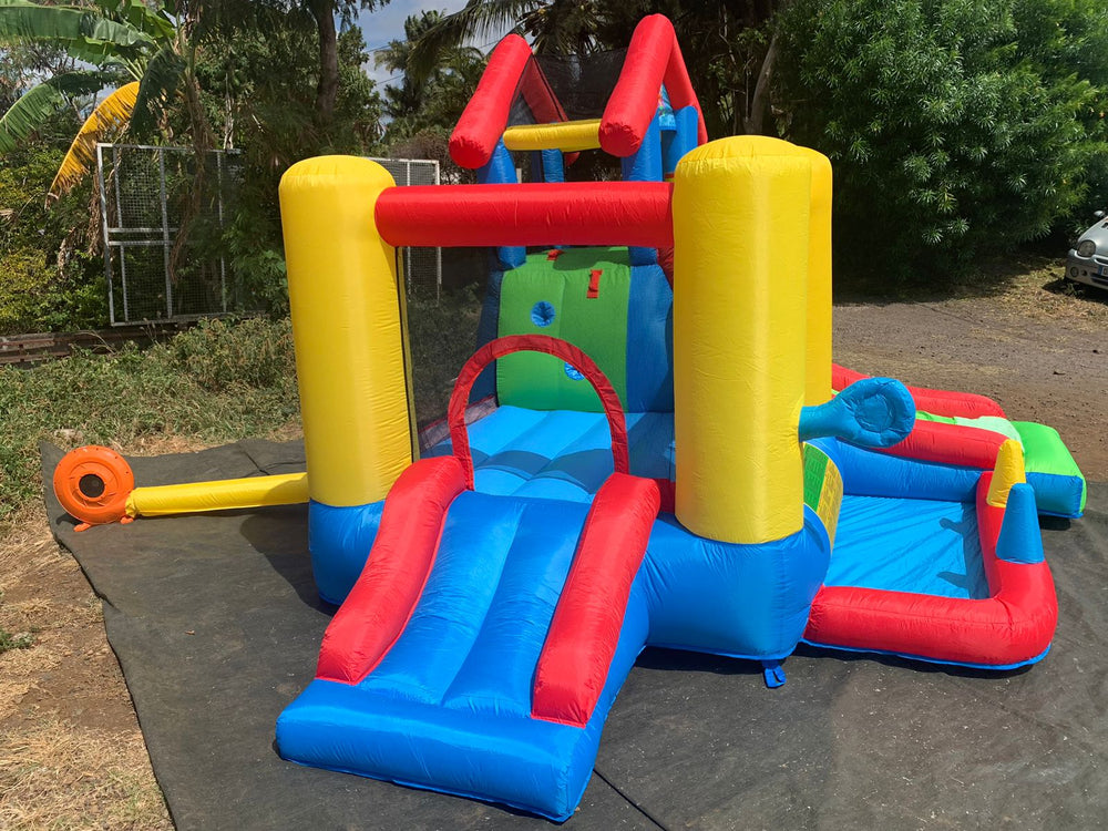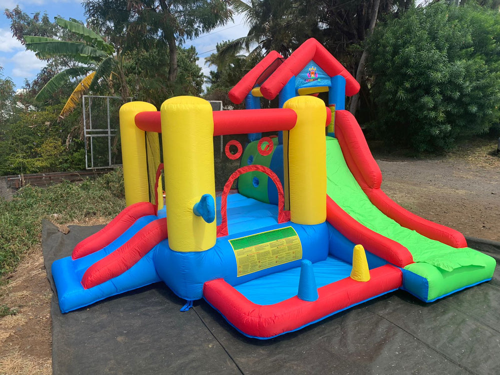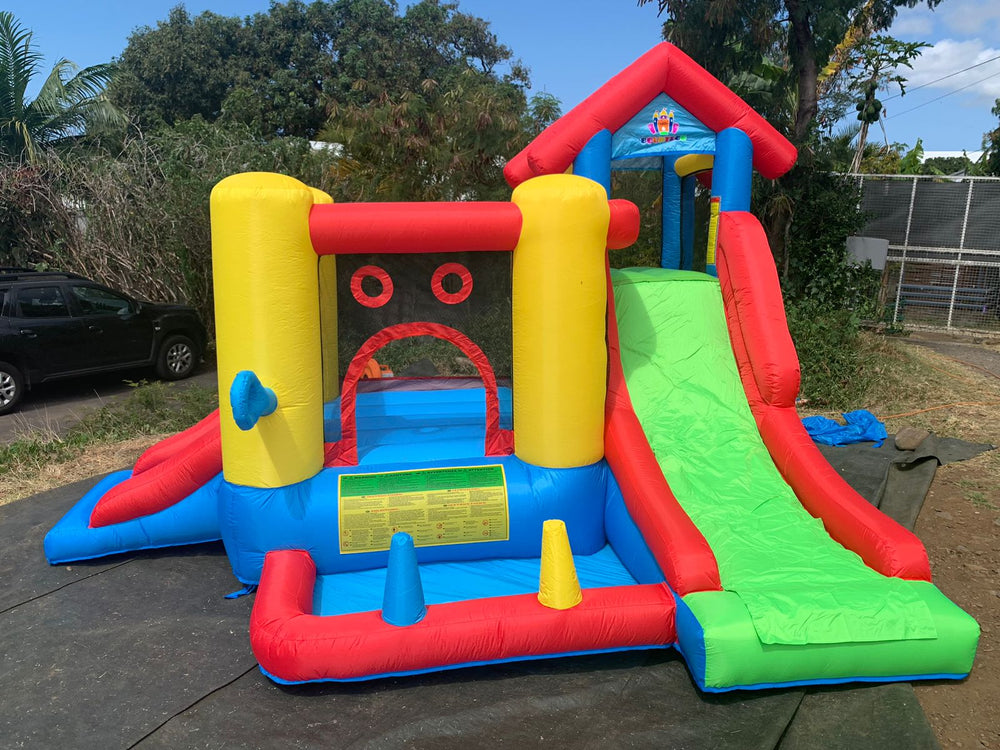 Dimensions : 3m (Longueur) x 3,60m (largeur) x 2,35m (Hauteur)Tranche d’âge conseillée : de 2 à 5 ans.Structure conçue pour 5 jeunes joueurs.Caractéristiques :- Deux toboggans- Un espace pour sauter- Une piscine à balles (balles incluses)- Un mur d'escalade- Un jeu de lancer d'anneaux